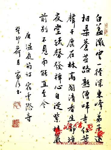 《歷代詩人詠鄠縣》冊頁之四十四 [唐〕溫庭筠 《宿云際寺》 白蓋微云一徑深, 東峰弟子遠(yuǎn)相尋。 蒼苔路熟僧歸寺, 紅葉聲干鹿在林。 高閣清香生靜境, 夜堂疏磬發(fā)禪心。 自從紫桂巖前別, 不見南能直至今。 《全唐 ...