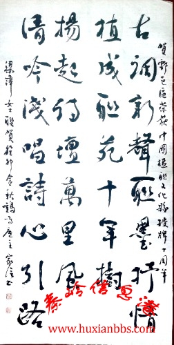 書梁萍女士對聯(lián): 賀鄠邑區(qū)(戶縣) 榮獲“中國楹聯(lián)文化縣”授牌十周年 古調新聲,聯(lián)墨抒情,植成聯(lián)苑十年樹; 清吟淺唱,詩心引路,揚起詩壇萬里風。 ...